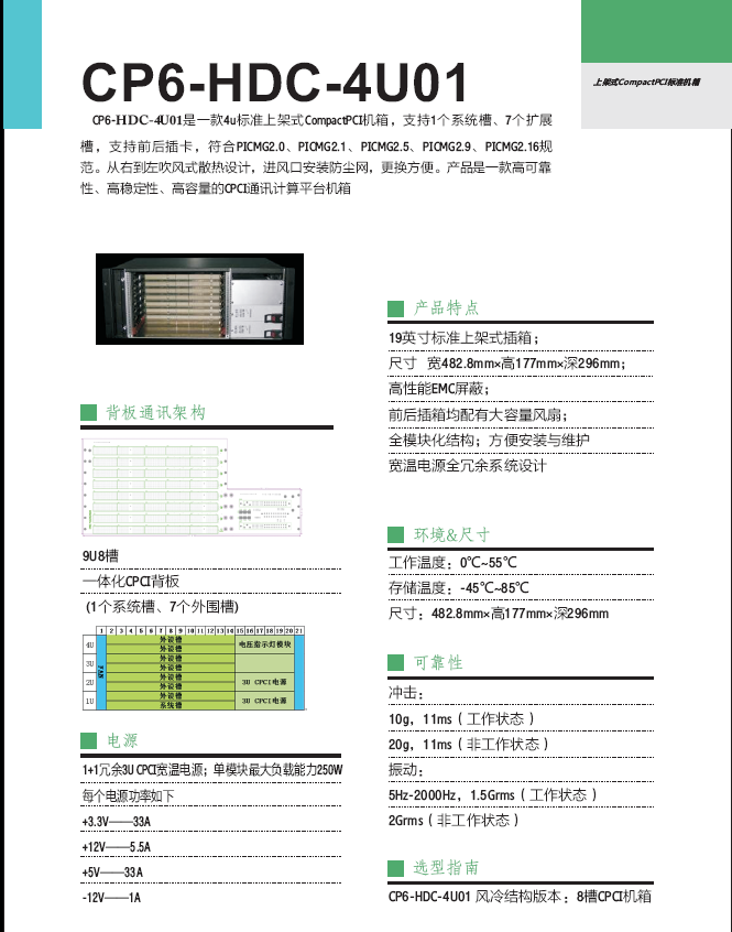 19英寸標準上架式插箱; 尺寸 寬482.8mm×高177mm×深296mm; 全模塊化結(jié)構(gòu);方便安裝與維護 寬溫電源全冗余系統(tǒng)設計 高性能EMC屏蔽; 前后插箱均配有大容量風扇;