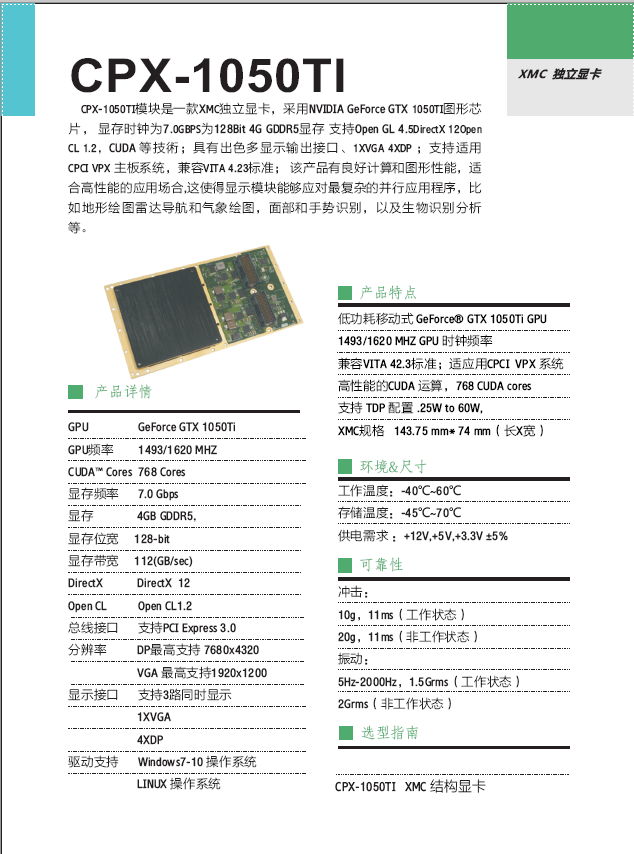 CPX-1050TI模塊是一款XMC獨(dú)立顯卡,采用NVIDIA GeForce GTX 1050TI圖形芯片, 顯存時(shí)鐘為7.0GBPS為128Bit