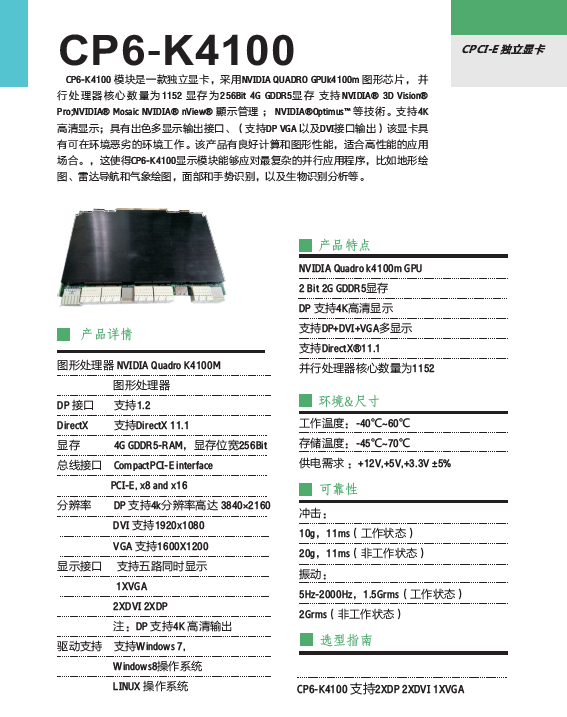 CP6-K4100 模塊是一款獨立顯卡,采用NVIDIA QUADRO GPUk4100m 圖形芯片, 并行處理器核心數量為1152 顯存為256Bit 4G GDDR5顯存 支持NVIDIA? 3D Vision? Pro;NVIDIA? Mosaic NVIDIA? nView? 顯示管理 ; NVI...
