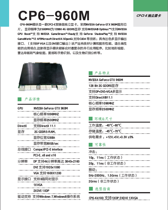 CP6-960M模塊是一款CPCI-E發(fā)燒級獨立顯卡,采用NVIDIA GeForce GTX 960M圖形芯片, 顯存頻率為2500MHZ為128Bit 4G GDDR5顯存 支持NVIDIA? Optimus?1支持NVIDIA GPU Boost?支持NVIDIA GameStream?-Ready支持GeFo...