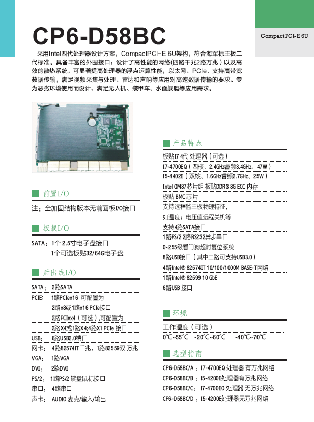 采用Intel四代處理器設(shè)計(jì)方案,CompactPCI-E 6U架構(gòu),符合海軍標(biāo)主板二代標(biāo)準(zhǔn)。具備豐富的外圍接口;設(shè)計(jì)了