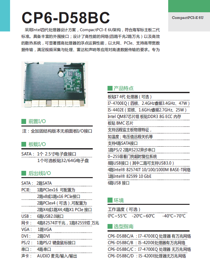 采用Intel四代處理器設(shè)計(jì)方案,CompactPCI-E 6U架構(gòu)符合海軍標(biāo)主板二代