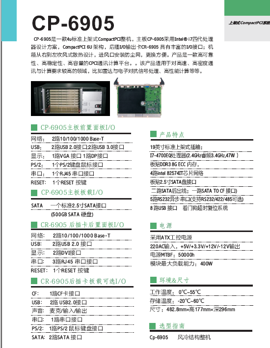 CP-6905是一款4u標(biāo)準(zhǔn)上架式CompactPCI整機(jī),主板CP-6905采用Intel? i7四代處理器設(shè)計(jì)方案,CompactPCI 6U 架構(gòu),后插I/O輸出卡CR-6905 具有豐富的I/O接口;機(jī)箱從右到左吹風(fēng)式散熱設(shè)計(jì),進(jìn)風(fēng)口安裝防塵網(wǎng),更換方...