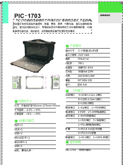 PIC-1703是針對車載和野外工作環(huán)境開發(fā)的一款便攜式計(jì)算機(jī),產(chǎn)品采用專用加固主板和優(yōu)質(zhì)鋁合金結(jié)構(gòu),堅(jiān)固、