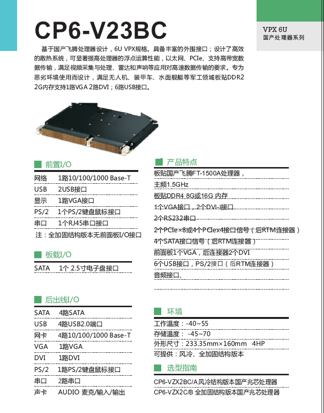 基于國產(chǎn)飛騰處理器設(shè)計(jì),VPX 6U結(jié)構(gòu),具備豐富的外圍接口,設(shè)計(jì)高效的散熱系統(tǒng),