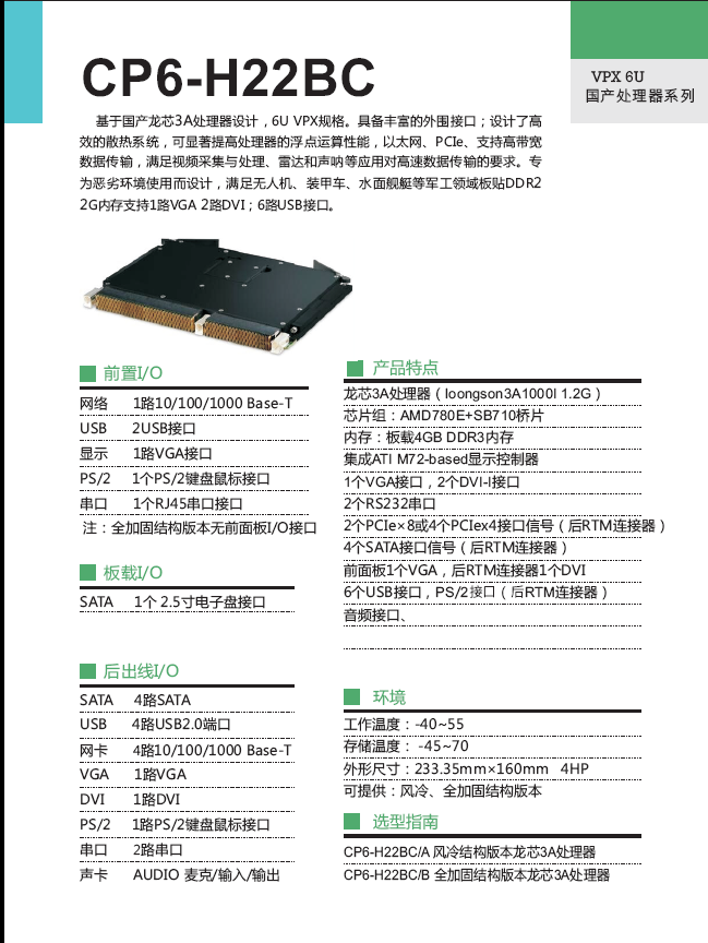基于國產(chǎn)龍芯3A處理器設計,6U VPX規(guī)格。具備豐富的外圍接口;設計了高