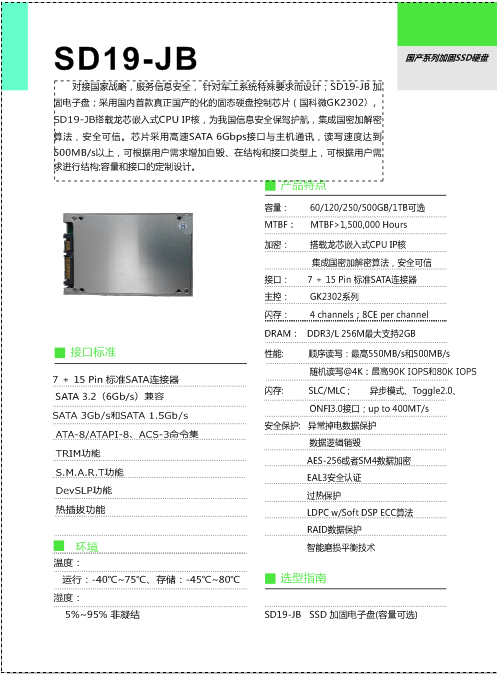 對(duì)接國(guó)家戰(zhàn)略,服務(wù)信息安全, 針對(duì)系統(tǒng)特殊要求而設(shè)計(jì);SD19-JB 加固電子盤(pán);采用國(guó)內(nèi)首款真正國(guó)產(chǎn)的化的固態(tài)硬盤(pán)控制芯片(國(guó)科微GK2302),