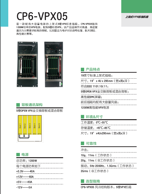 CP6-VPX05 是一款配有大容量電源的上架式5槽VPX標準插箱。CP6-VPX05提供 1200W功率的VPX電源,配有5槽標準VPX。該產(chǎn)品適用于對高速、高密度 通訊與計算要求較高的領域,比如雷達與電子對抗信號處理、航天測控、 高性...